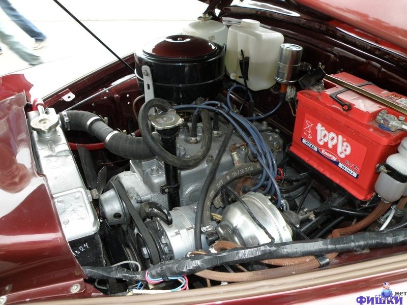 Тюнинг в классическом (скромном) виде. Смотрится выдержано в старых классических формах, но при этом добавления очень в тему. Все исполнено на 100% – это видно даже по фотографиям. Отличный цвет и покраска, а так же патриотично исполненный герб СССР на капоте. Салон так отлично выглядит, хороший материал, только не хватает полностью отхромированного руля –стоимость руля около 500 долларов, так, что понятно почему его просто обтянули тканью). Но, ткань салона, панель, приборы, по моему исполнены отлично. Фотография подкапотного пространства показывает, что и там полный порядок, в общем, смотрите сами… belretro ставит 5 за такую работу.